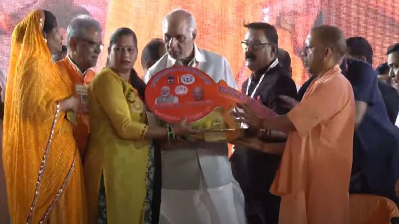 लाभार्थी को प्रतीकात्मक चाबी देकर सम्मानित करते सीएम योगी